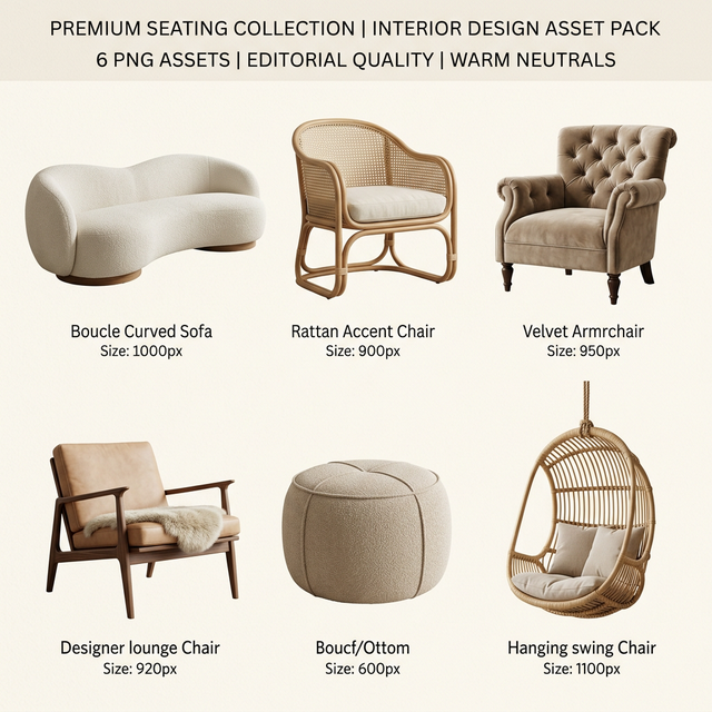 You get instant access to a digital download containing: 4,000+ furniture & decor PNGs, 2,000+ material textures, 50 moodboard templates (Canva, Photoshop, Procreate), 60 Instagram templates, the DAS AI Rendering System guide, the Client Presentation Pack, and 100 AI Prompts. Everything is available for immediate download.